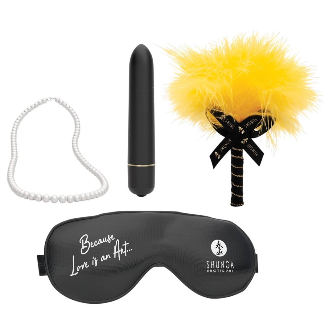 4 erotikus kiegészítő (mini vibrátor, gyöngylánc, szemmaszk, tollpihe)