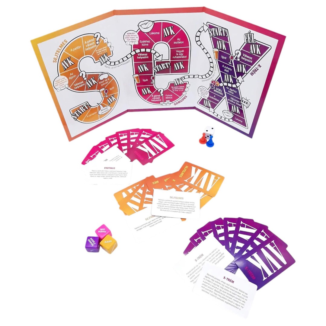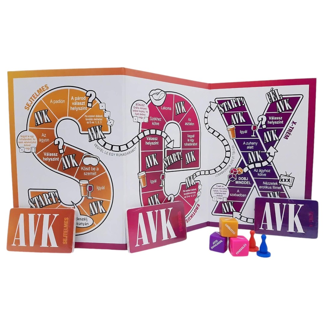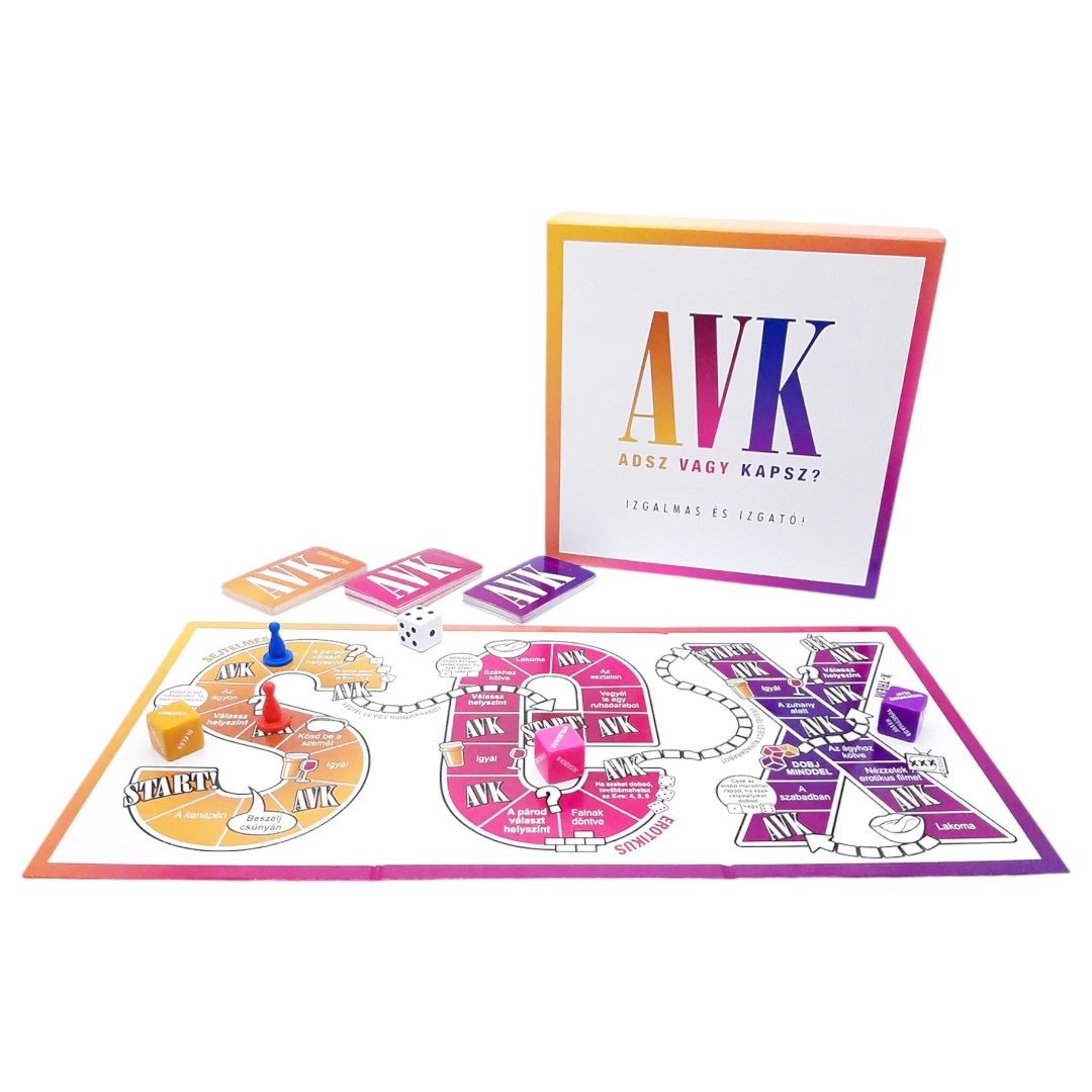 Az AVK: Adsz Vagy Kapsz egy fokozatosan építkező játék, amely a meghitt beszélgetésektől vezet el a szenvedélyes, gátlások nélküli szexig. A játéktáblán a SEX betűit bejárva haladhattok végig három izgalmas fázison: